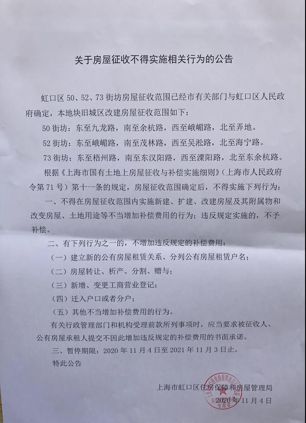 关于虹口区50、52、73街坊旧城区改建意愿征询公告,关于房屋征收不得实施相关行为的公告已在梧州路35号、东汉阳路219弄、吴淞路444弄、余杭路133弄公示,大家记得要去关注哟!