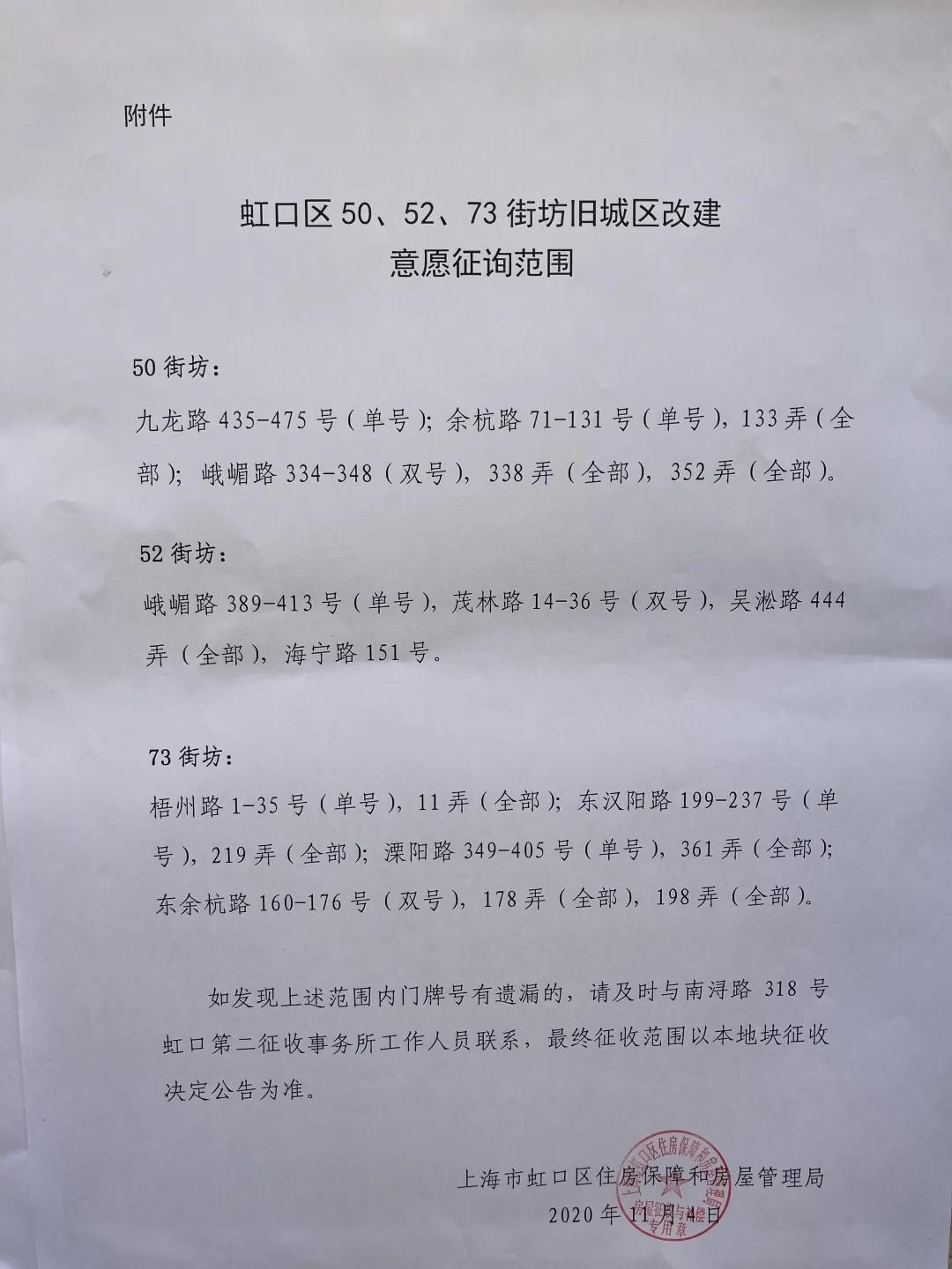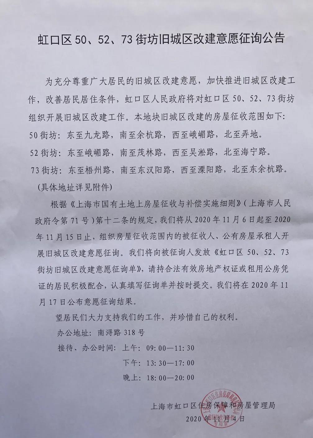 虹口区人民政府于2020年11月6日起对虹口区50、52、73街坊实施旧城区改建第一轮意愿征询工作。