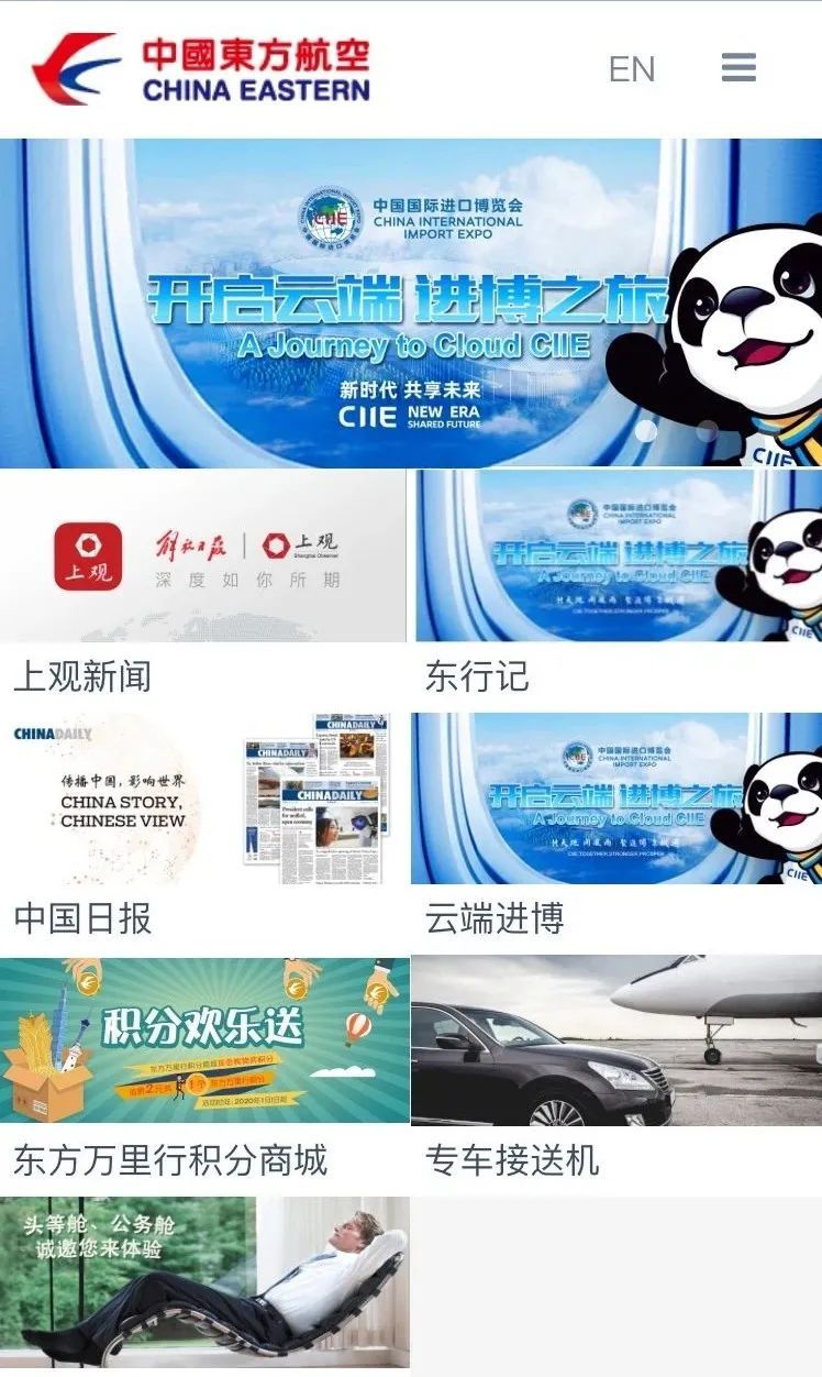 此外,东航的空中WIFI平台也将上线“东航进博会云端分会场”,聚合展示进博会官网、进博新闻等专题内容。旅客在乘坐东航航班时,可通过空中WIFI登录界面的进博专栏便捷访问相关内容,实时了解进博会最新动态。了解详情,请戳文末“阅读原文”哦~~