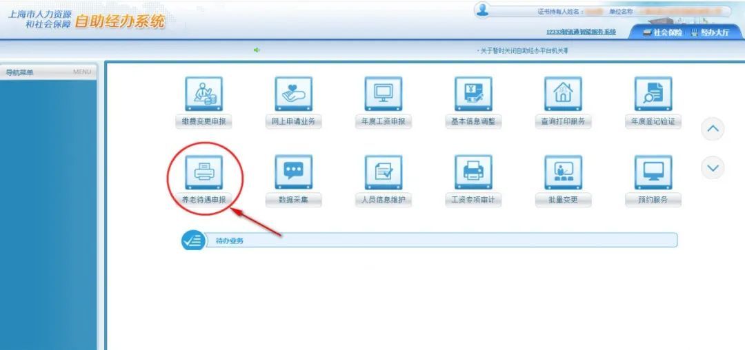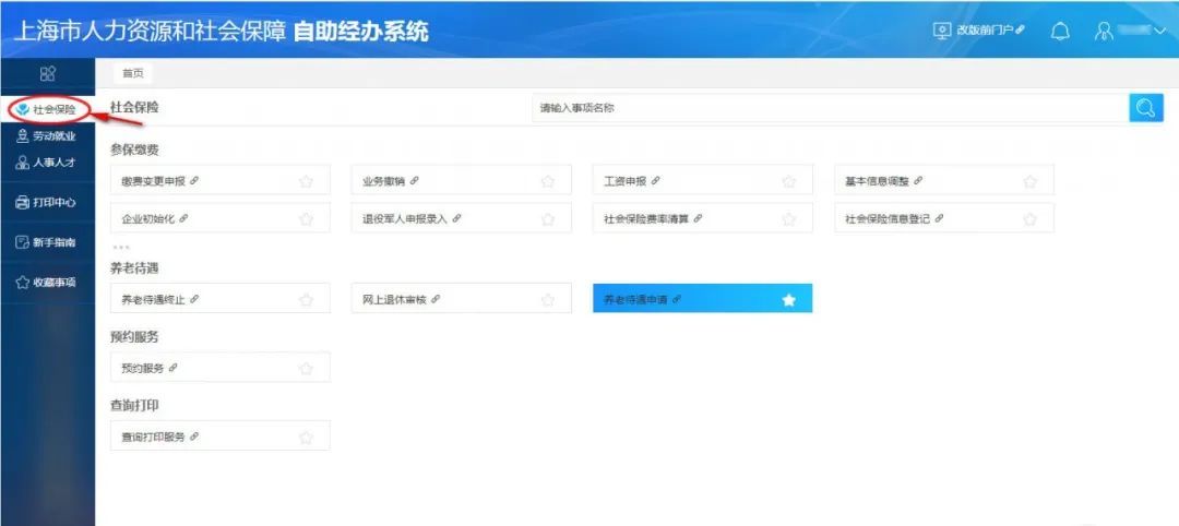 登录“上海市人力资源和社会保障自助经办系统”,点击“社会保险”服务界面。