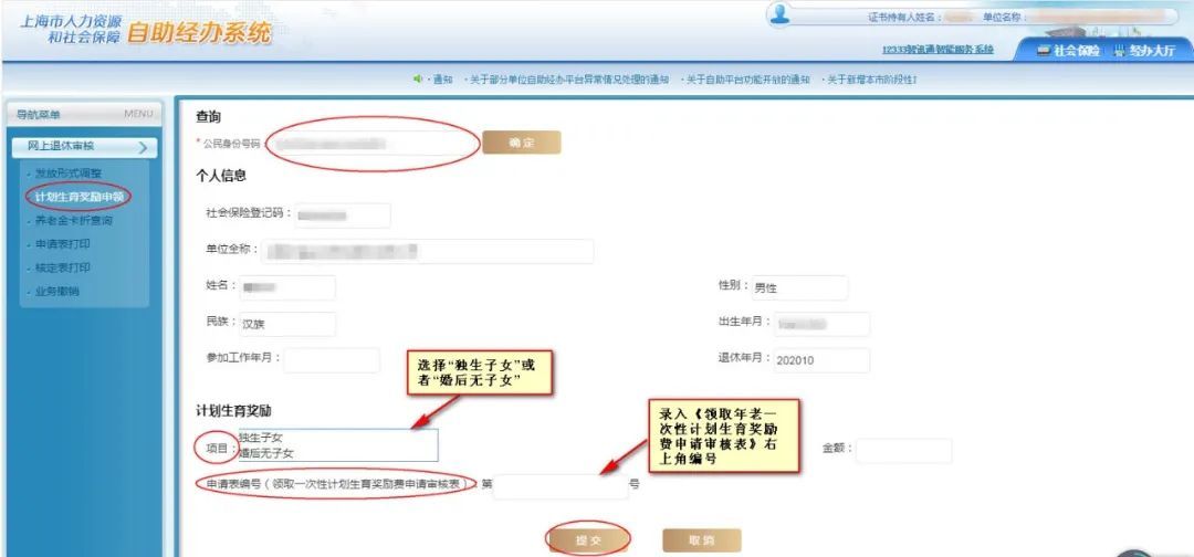 在“计划生育奖励”的“项目”一栏中根据《领取年老一次性计划生育奖励费申请审核表》(以下简称《审核表》)中审核意见内容选择“独生子女”或者“婚后无子女”,在“申请表编号(领取一次性计划生育奖励费申请审核表)”栏目录入《审核表》右上角的编号,填写完毕后,点击“提交”按钮,即申报成功。