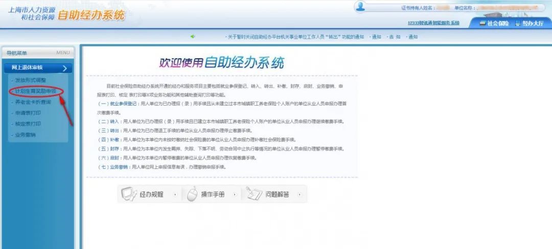 点击“养老待遇申报”模块,再点击左侧菜单栏 “计划生育奖励申领”栏目。