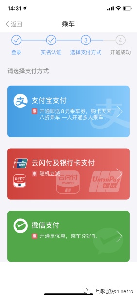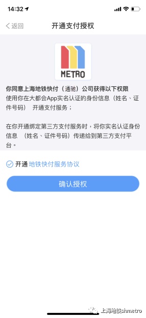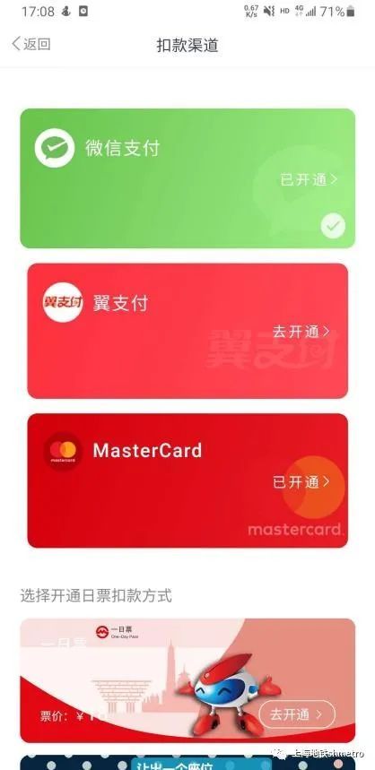 A.注册登录大都会APP后,在【我的】—【设置】—【上海地铁支付方式管理】—【微信支付】,再到【我的钱包】—【扣款渠道】—【万事达卡】,完成免密支付授权。