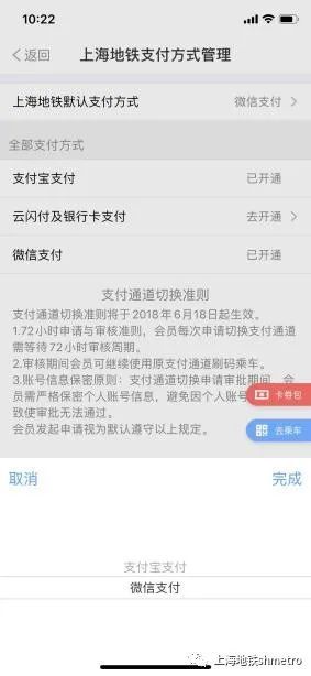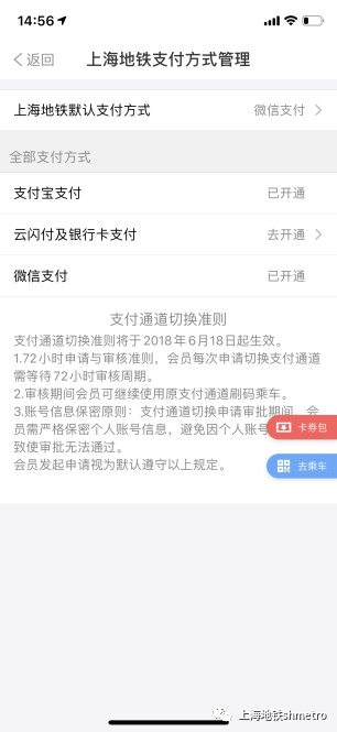 (2)若用户目前支付方式为“支付宝”或“云闪付及银行卡支付”,用户需在“我的—设置—上个地铁支付方式管理—上海地铁默认支付方式”切换至微信支付,而后调整扣款方式。