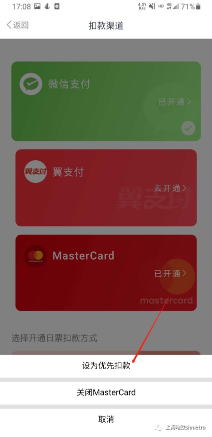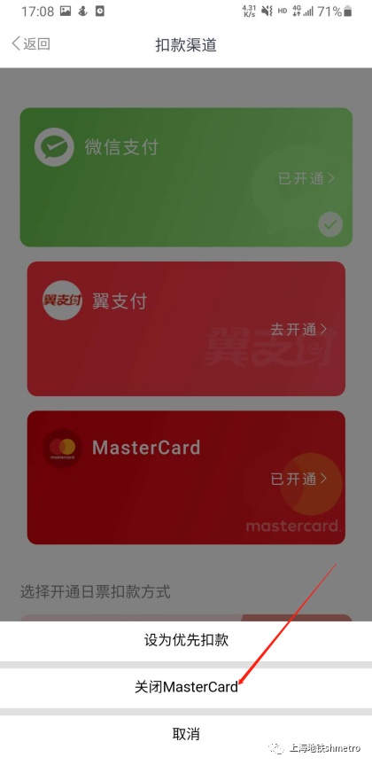 (1)若用户目前支付方式为“微信支付”,至我的—我的钱包—“扣款渠道”—“万事达卡”