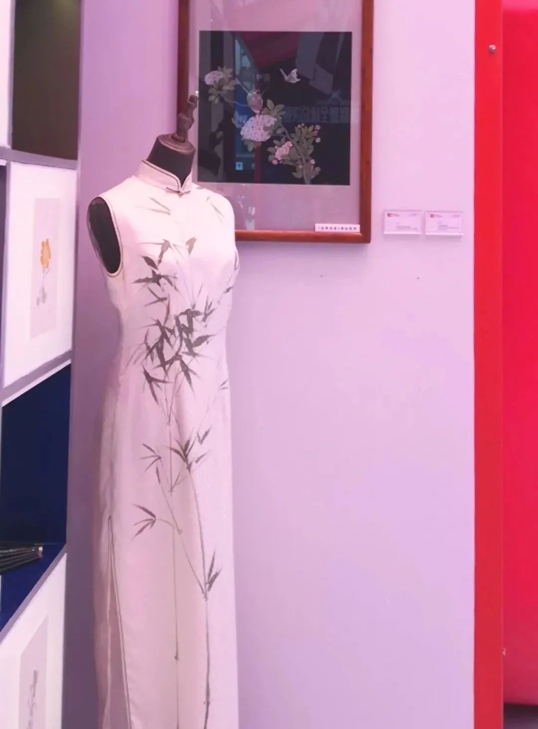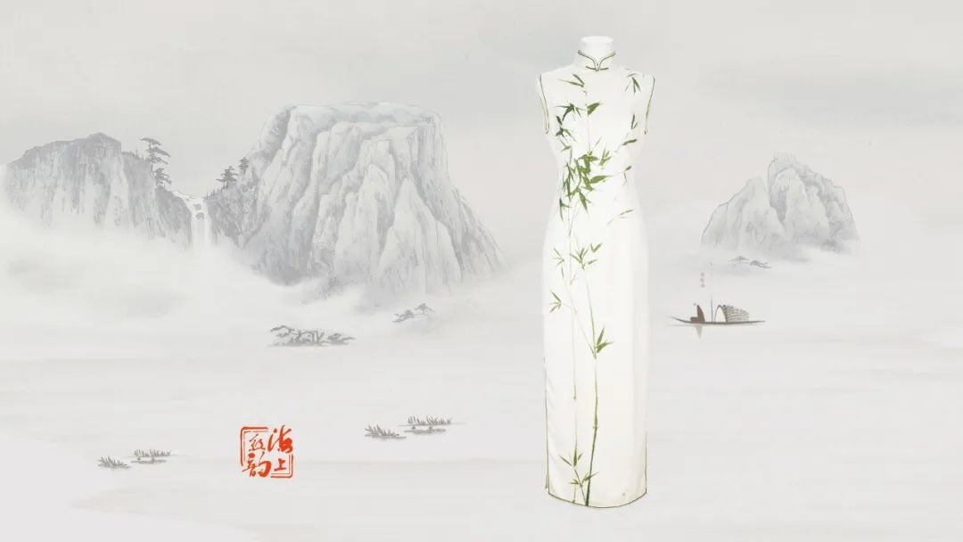 此次参展的手绘海派旗袍,采用本白色立体花纹面料,手绘艺术将那一片片错落的竹叶竹竿,虚虚实实,绘制得栩栩如生,沉淀出尘世繁华的美丽。立领盘扣点缀,经典不容忽视,与竹叶呼应的浅竹绿包边勾勒,潋滟着岁月里的柔情与嫣婉。