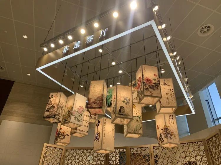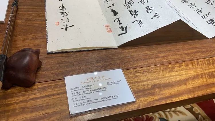 由徐汇区凌云街道社区学校专兼职老师和学员全手工造纸和制作的非遗古纸手工灯和手工册页在新闻中心非遗客厅的中心位置华丽亮相。