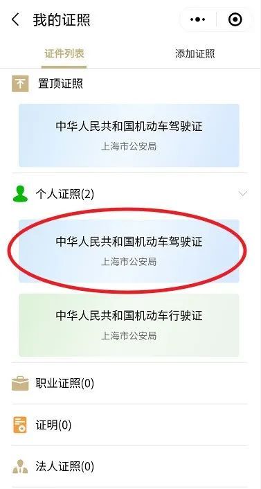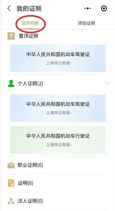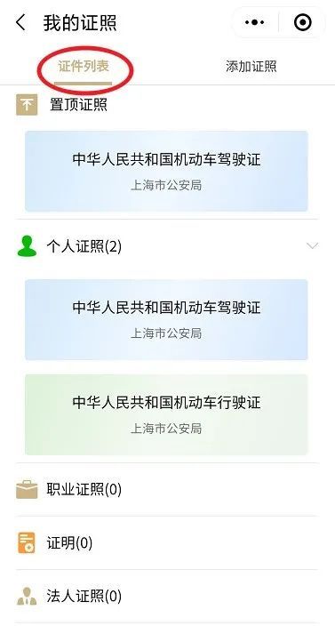 ⑤完成上述操作后,点击“我的证照”中“证照列表”标签,在“个人证照”栏下即会新增“中华人民共和国机动车驾驶证”。