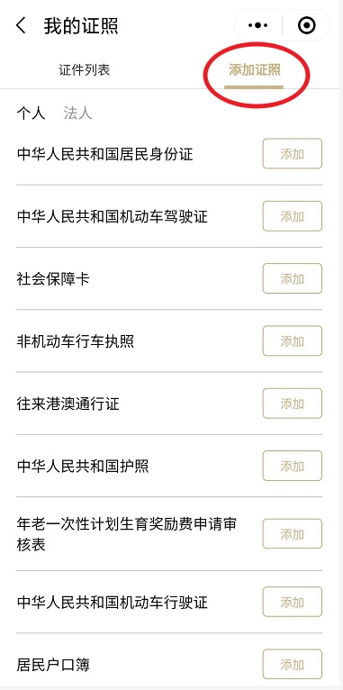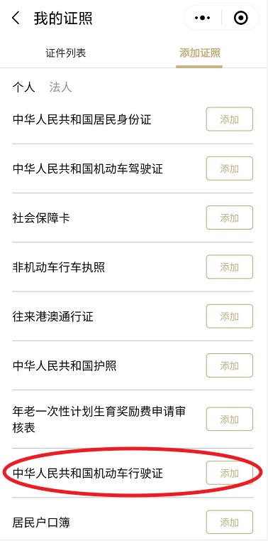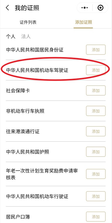 ④在下方菜单中选择“中华人民共和国机动车驾驶证”,点击右方的“添加”按键。