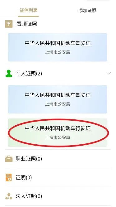 ⑤完成上述操作后,点击“我的证照”中“证照列表”标签,在“个人证照”栏下即会新增“中华人民共和国机动车行驶证”。