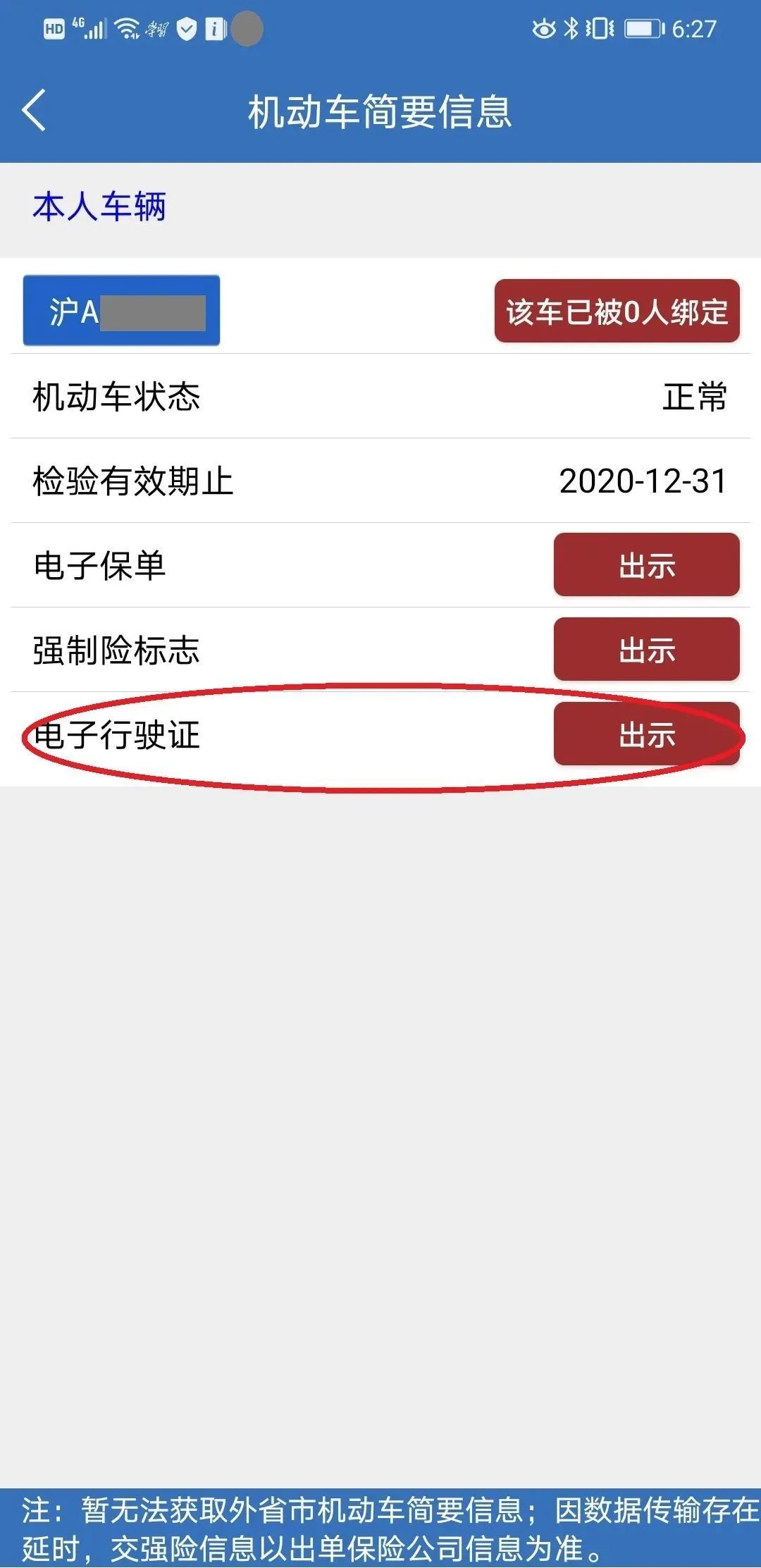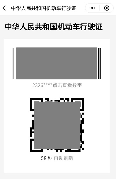 ⑦页面显示电子行驶证(包括主页、副页信息),点击页面下方的“亮证二维码”还将显示条形码、二维码信息。