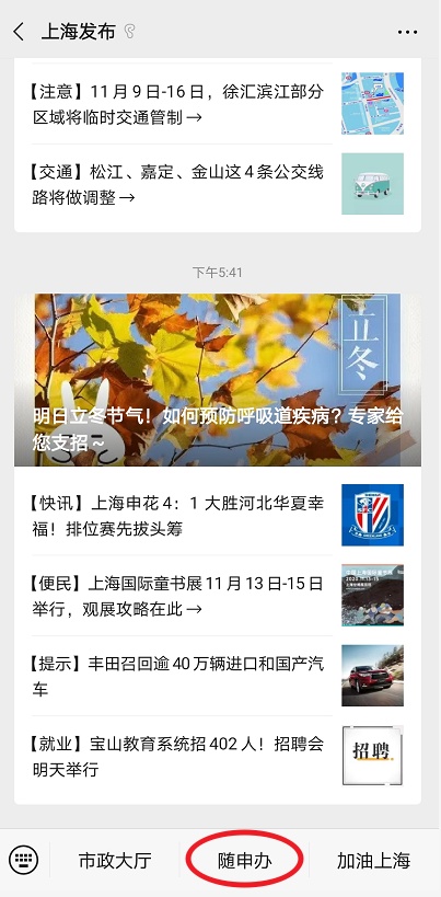①打开“上海发布”微信公众号,点击下方“随申办”按钮。