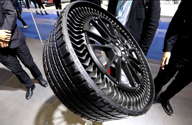 这款亚洲首发的Uptis轮胎,被称为“明日轮胎”,最大特点在于免充气、防刺扎轮胎突破性的结构设计;同时,轮胎还使用了更少的橡胶组织,展现了可持续的理念。工作人员介绍,这款轮胎计划在2024年上市。