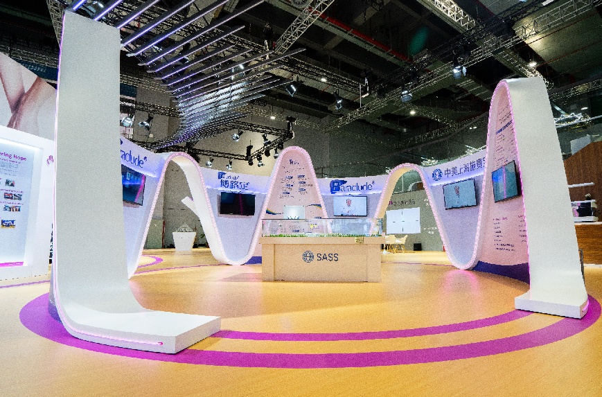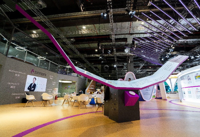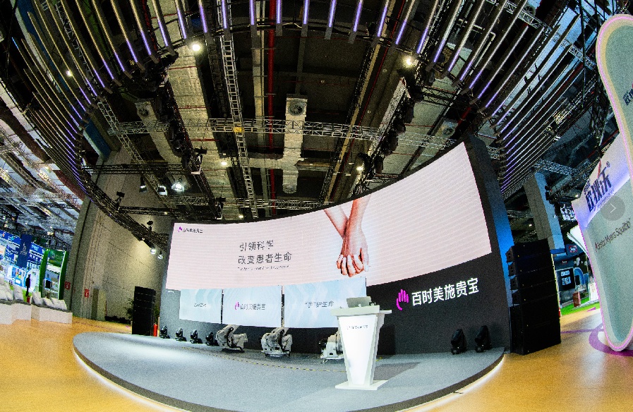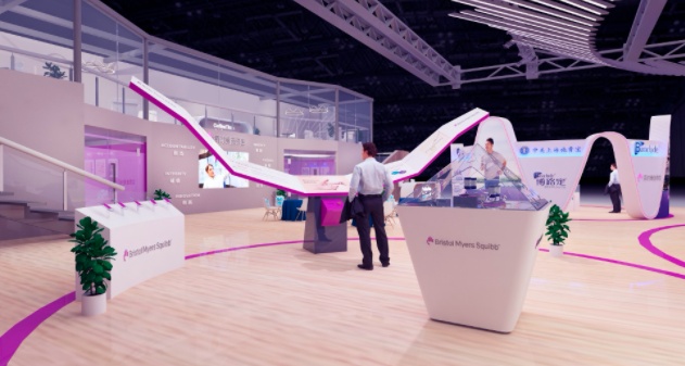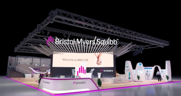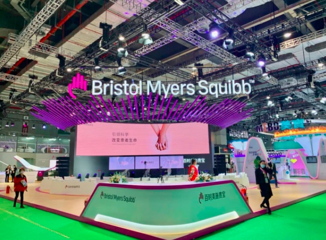 第二次参与进博会,百时美施贵宝的展台充满了科学与创新的气息。800平方米的超大展区正中央的主舞台区域,布置了三个硕大的机械臂,用创新的工业5.0方式展现其创新理念。