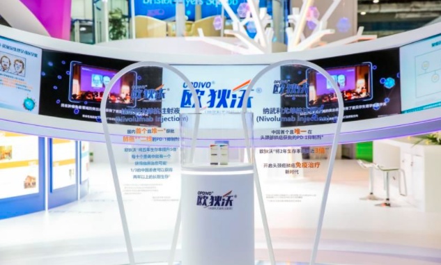 互动装置区的对侧,是百时美施贵宝的主打产品——免疫肿瘤药物欧狄沃®的专属展区。 作为全球和中国首个获得批准的抗PD-1抑制剂,欧狄沃®在改善患者生存率上有着惊艳的表现。欧狄沃®是全球首个证实能够为晚期非小细胞肺癌患者带来生存获益、且显著提升五年生存率的PD-1抑制剂,无论PD-L1表达状态如何,欧狄沃®将患者五年生存率提升5倍。对于复发性和转移性头颈部鳞癌以及晚期胃癌患者,欧狄沃®也能显著延长患者的生存期,提高生命质量。