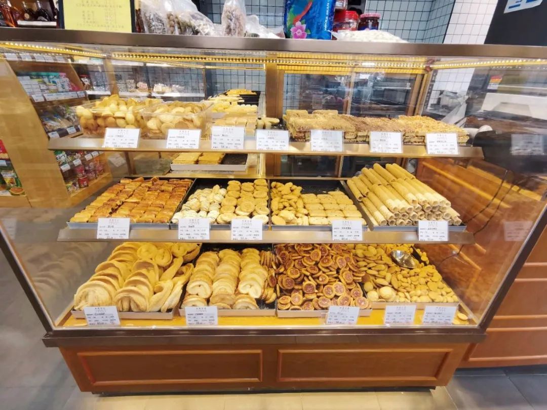 右侧的点心柜台里,有西区老大房现烤的鲜肉月饼,每天现烤现卖。泰康食品各类糕点品种丰富,不仅有花生排、金丝蛋卷皇、豆沙卷、蝴蝶酥等,色泽金黄诱人,还有现烤的椰丝酥、叉烧酥、榴莲酥、一口酥等,新鲜出炉的小点心口感最好也最受顾客欢迎。