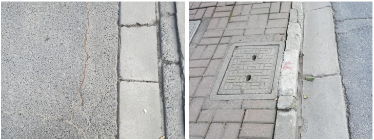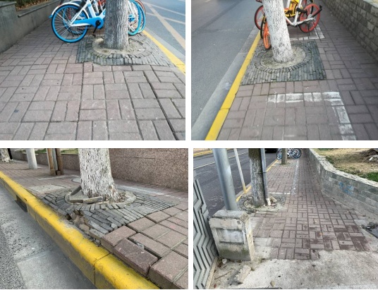 银亭路人行道使用时间较长,人行道整体磨损较为严重,局部缺失、松散情况较为集中。树穴处人行道拱起严重。道路原本不宽,道路两侧停满了各色共享单车,影响居民通行。