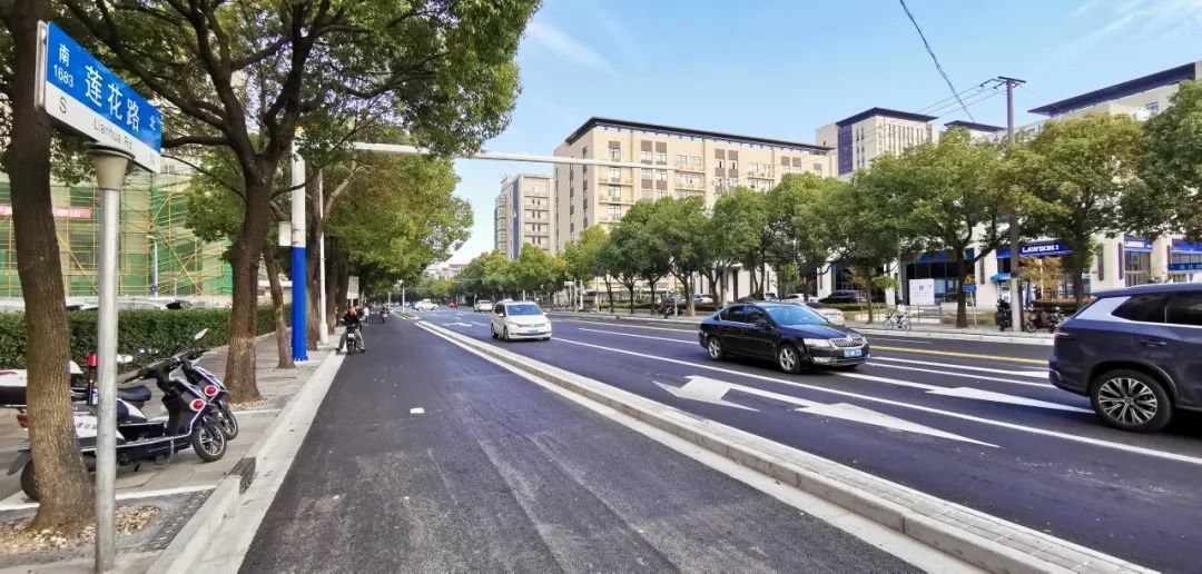 环镇南路中修,铺设了全新路面,对道路两旁的路边条石进行更新,铺设了全新的人行道砖。
