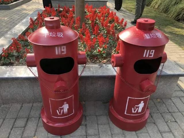 分类投放的垃圾箱也是消防栓造型