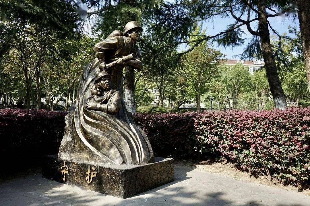 远远站在公园入口处,就能看到一尊雕塑:一名消防指战员怀抱孩子逃离危险区域。配上左侧的公园题词,显示出这个公园的主题,是以消防元素为主题的公园。