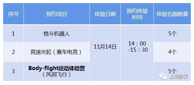 感兴趣的朋友请编辑文字:“科技体育+姓名+手机号码+项目名称”(如是预约Body-flight运动体验营(风洞飞行),请编辑“科技体育+姓名+手机号+项目名称+顺丰快递到付邮寄地址”),发送给“上海静安”官方微信后台,静宝将随机抽取14位粉丝,每人送出相应体验名额1个。中奖的小伙伴将收到静宝的回复哦。报名时间截止至11月10日11:00。