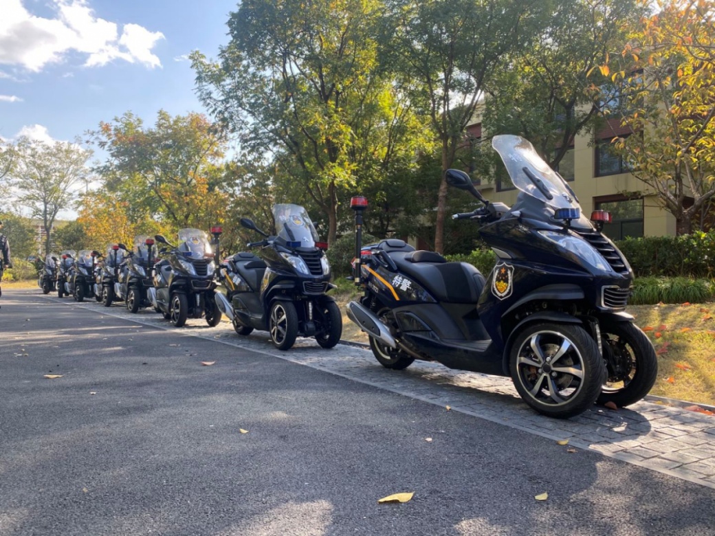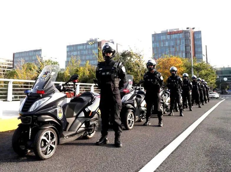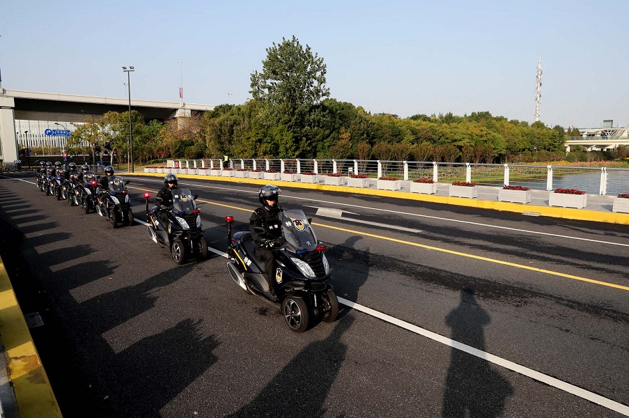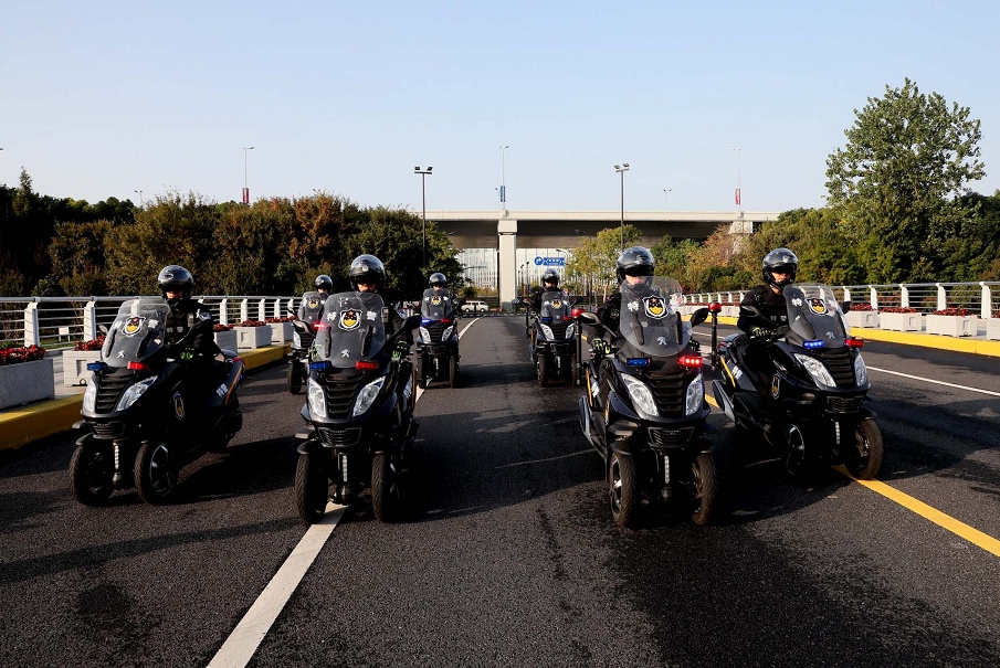 进博会期间,在整个虹桥枢纽区域,与往日有所不同是街面上出现了一辆辆警用三轮摩托,也成了往来市民快门下的一道风景线。