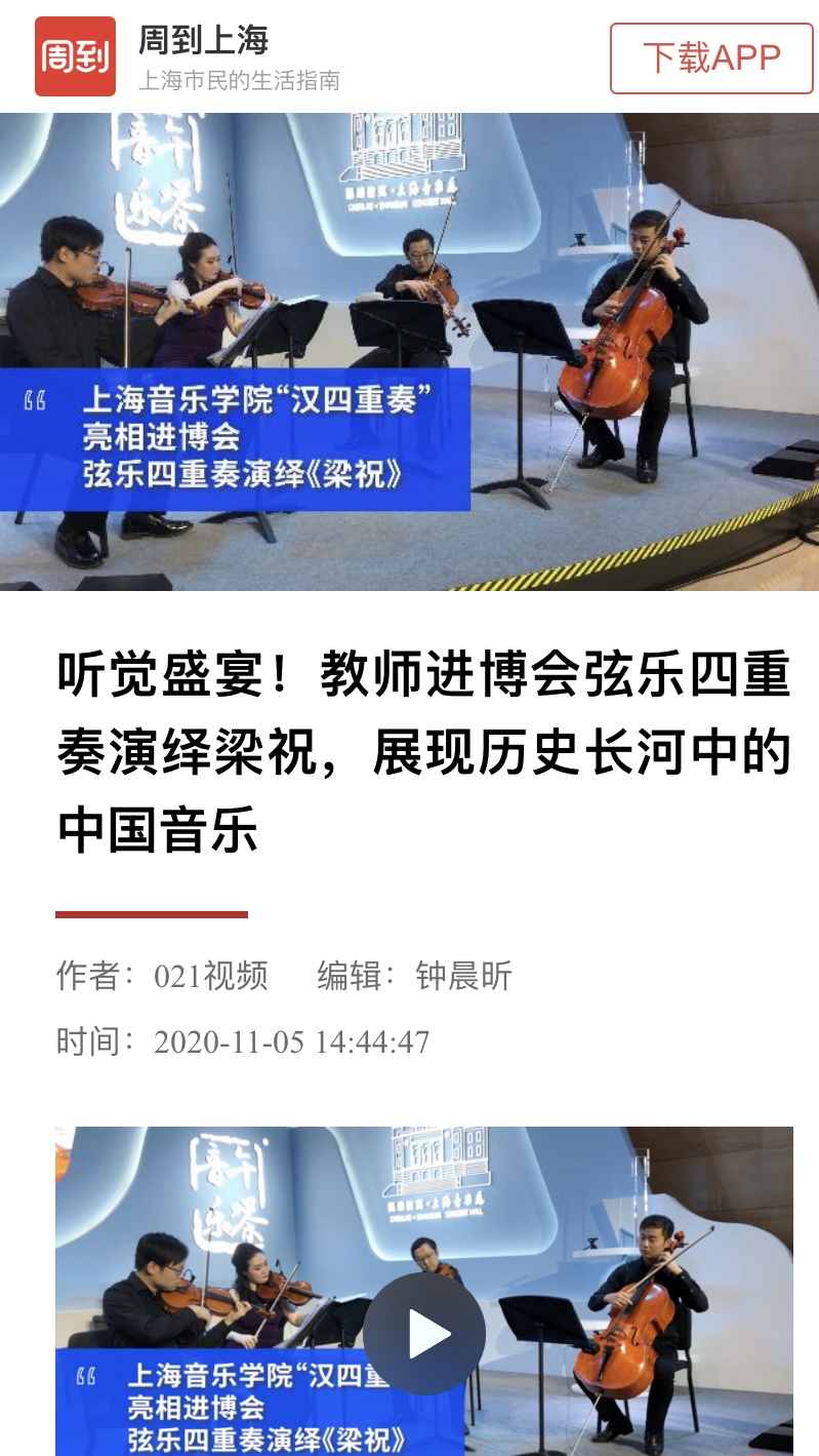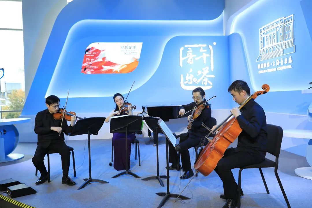 11月5日,“祖国的歌——弦乐四重奏专场音乐会”,上海音乐学院的演奏家组成的汉四重奏,以2把小提琴,1把中提琴,1把大提琴呈现享誉世界的《梁祝》弦乐四重奏版(首版),同时现场奏响了《我和我的祖国》,表达对伟大祖国的真诚歌颂。