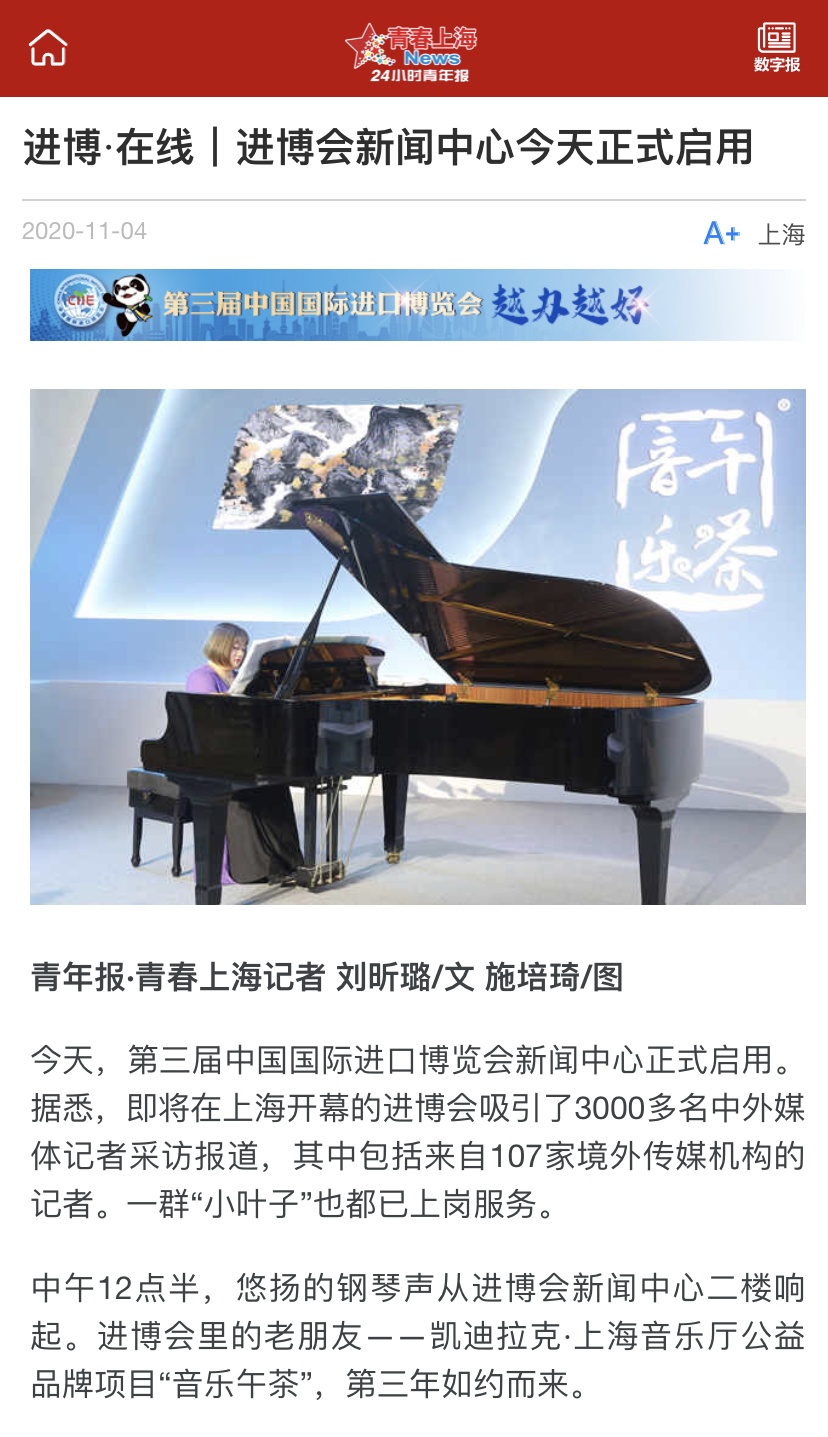 凯迪拉克·上海音乐厅公益品牌项目“音乐午茶”第三次亮相新闻中心二楼。七天来,“音乐午茶”突出“多元、创新、本土”特点,邀请到上海青年音乐人的杰出代表来到“音乐午茶”,他们是:旅德奥钢琴家唐瑾、旅欧钢琴家朱和、上海音乐学院汉四重奏,民族男高音陈剑波,民族女高音周杨、上海民族乐团时尚品弦组合、青年笛箫演奏家王俊侃,青年古琴演奏家陆笑姿,青年钢琴演奏家刘蕴……7天7场演出,通过进博会,展现上海青年音乐家的实力与魅力。