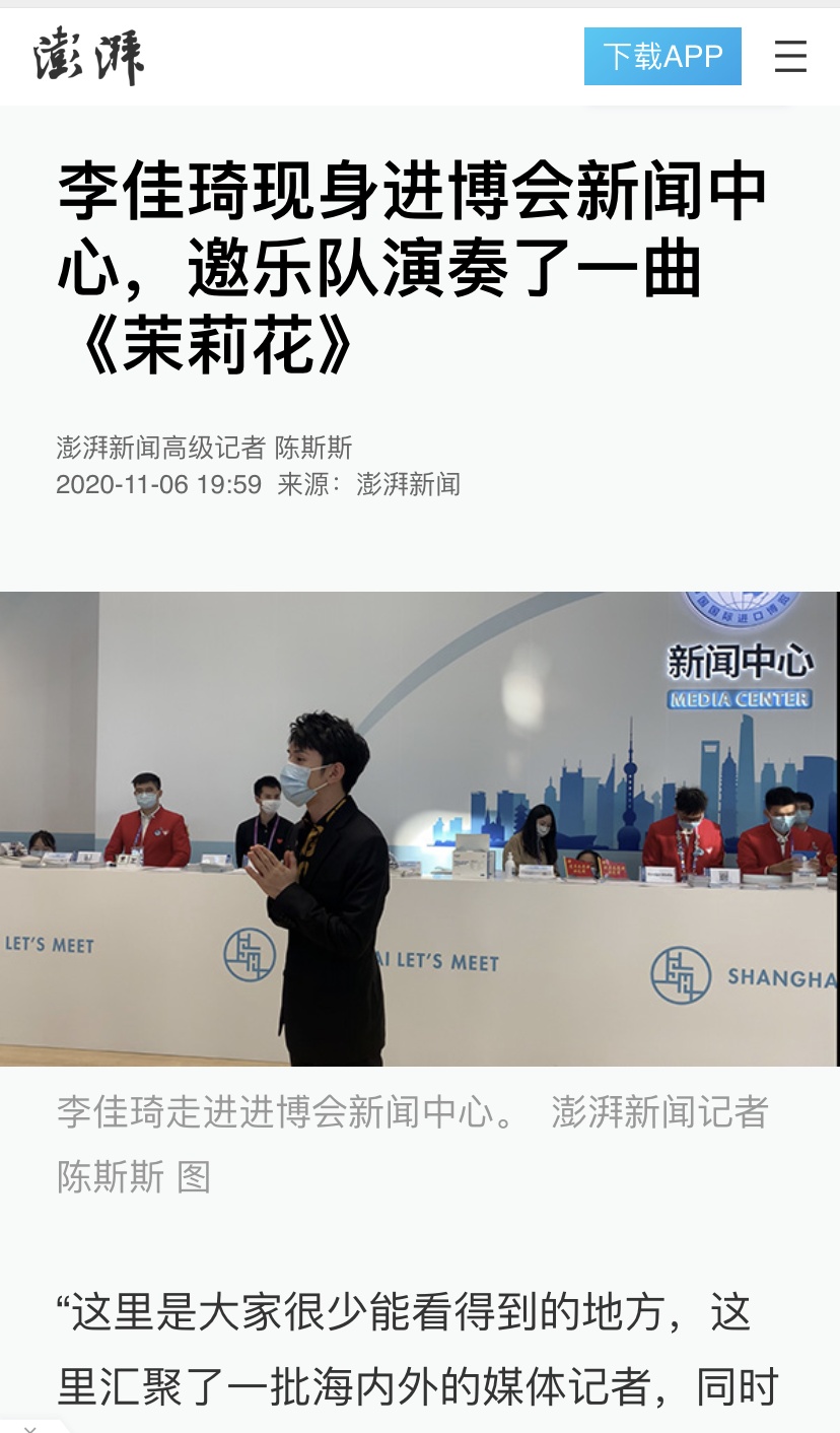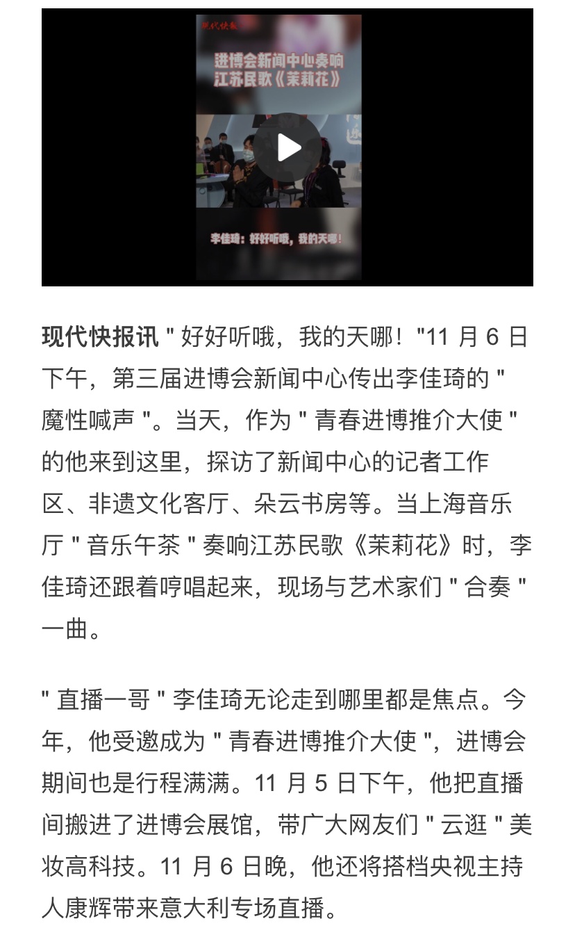 作为青春进博大使的李佳琦,11月6日探秘了进博会新闻中心,带网友“云”体验上海音乐厅“音乐午茶”,还在现场合作了一曲悦耳的《茉莉花》。