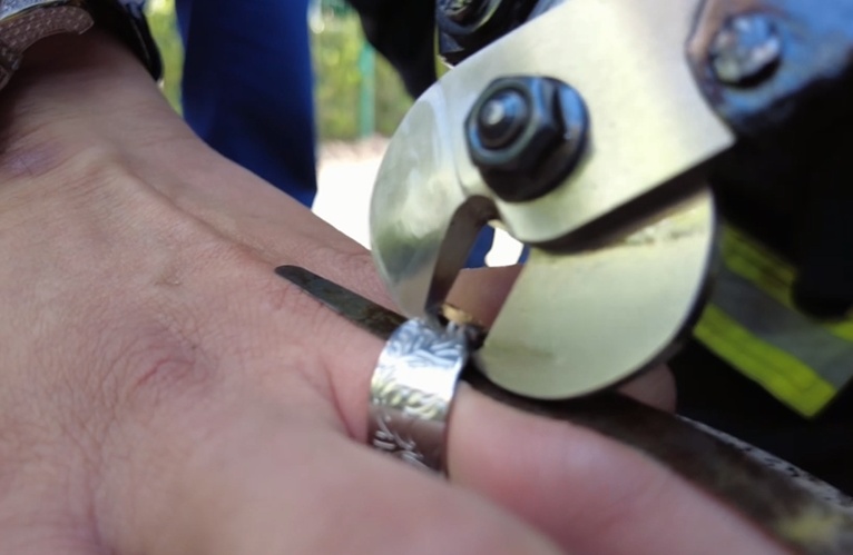 11月8日下午,一名男子因左手无名指被戒指卡住,向消防救援部门求助。救援人员到场后,亮出了一把新钳子,轻轻勾住戒指,几秒钟就剪断了。