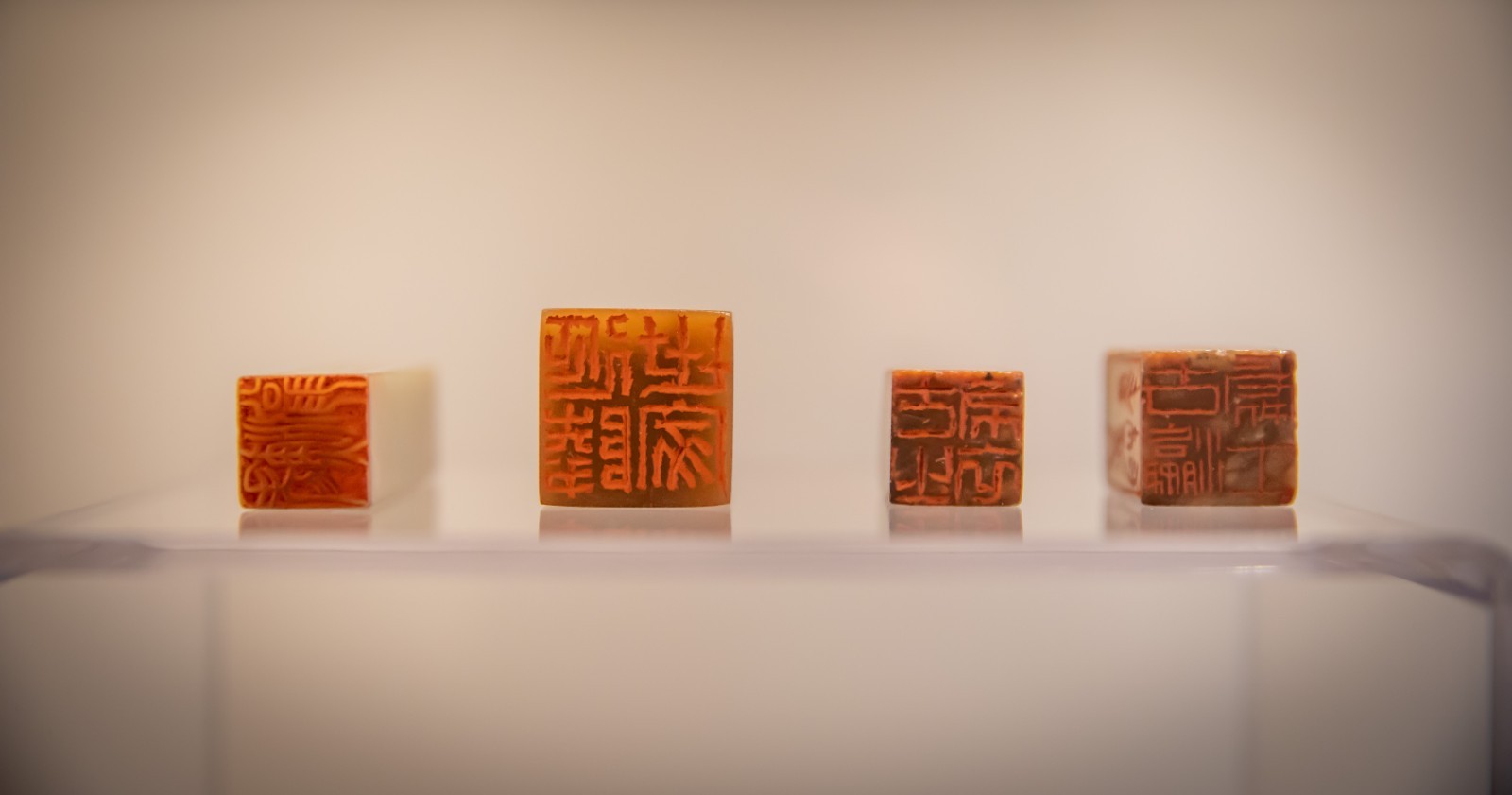 主办方介绍,金石学是中国考古学的前身,研究古代钟鼎彝器碑碣石刻﹑考辨今古文字的一种专门学问。本次展览作品由印章类和碑帖类两大部分组成。印章类主要从印材种类如铜、玉、翡翠、象牙、水晶等类别作展示,再从青田石、昌化鸡血石、寿山石(芙蓉、田黄、杜陵等)、广东绿等石种对高品质主流印石做展示。碑帖类主要包含:民国收藏大家周湘云的一批旧藏,如玉版十三行拓片、多宝塔碑、汉北海淳于长夏君碑、九成宫碑、峄山碑等拓本;当代制拓专家万寿老师精拓的竹制笔筒、臂搁、砚台、玉佩、扇骨等拓片。