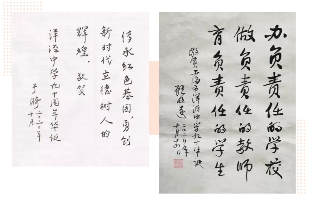 人民教育家于漪老师和中国教育学会会长顾明远先生分别为上海市洋泾中学九十周年题词。
