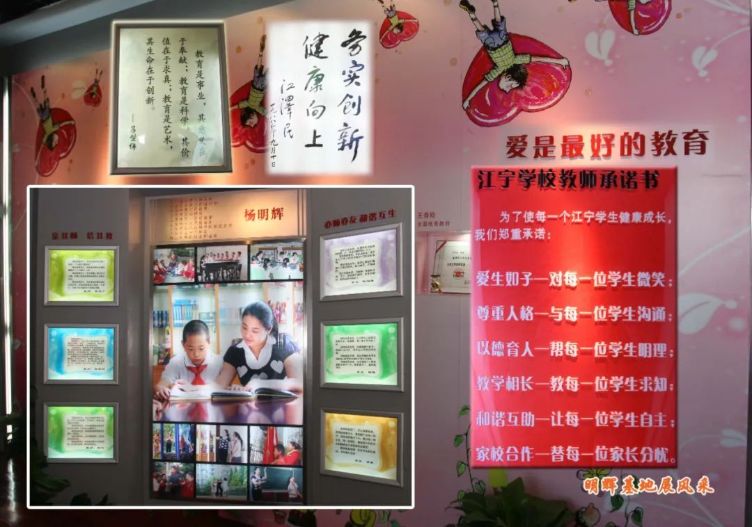 为了传承这些优秀教师的高尚师德和良好风范,江宁学校于2008年创建了“明辉教师教育基地”,从“师之魂、师之道、师之艺、师之志”等方面诠释了新时期师德的内涵,着力建设学习型、专业型、公益型教师群体发展平台和精神家园。