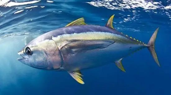 黄鳍金枪鱼和鲣鱼隶属于同一种类,都是群居型鱼类,南北半球都有它们的身影。这种鱼可在8年的时间里长到180千克,广受渔民欢迎。另外,为了适应深海的情况,黄鳍金枪鱼能够长途迁徙,并在途中全程保持高速游行。它们可以长时间以每小时80千米的速度游动。这要得益于它们独特的生理结构:它们身体两侧的凹槽中长有胸鳍,当黄鳍金枪鱼在洋流中游动时,胸鳍可以使身体呈流线型来减少游动时产生的阻力。这样一来,它们那鱼雷型的鱼身就可以轻而易举地穿透水流,进而减少游动时的体力消耗。