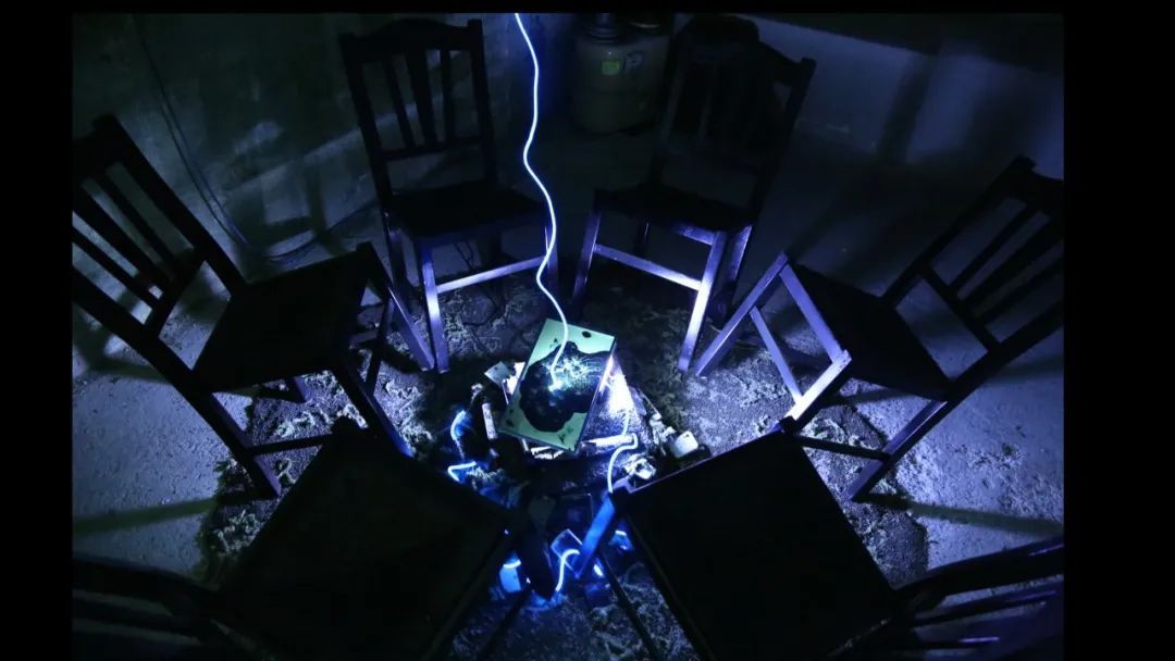 俞同舟& 杨晨 《过载》 尺寸可变 电子垃圾、木制椅子、泥土、LED 灯带 2018