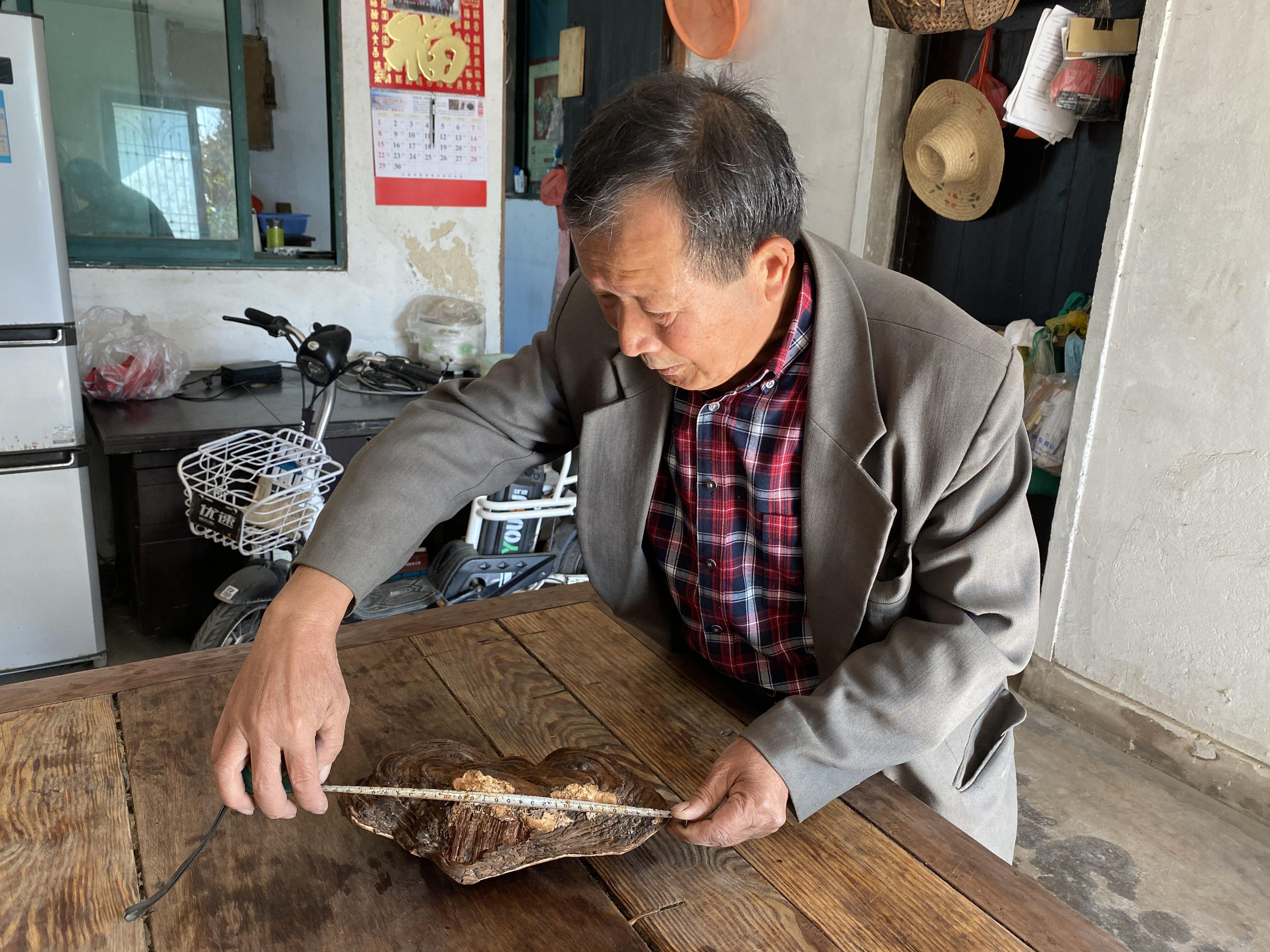 11月12日,记者在李金南家中看到了他口中所说的灵芝,实物约有一张A4纸张那么大,重量约有1200克。经过现场测量,灵芝长30厘米,宽16厘米,高9厘米。质地比较硬,正面为灰褐色,有环形纹路,翻过来看,背面则是一整块浅黄色,边缘微微发白。