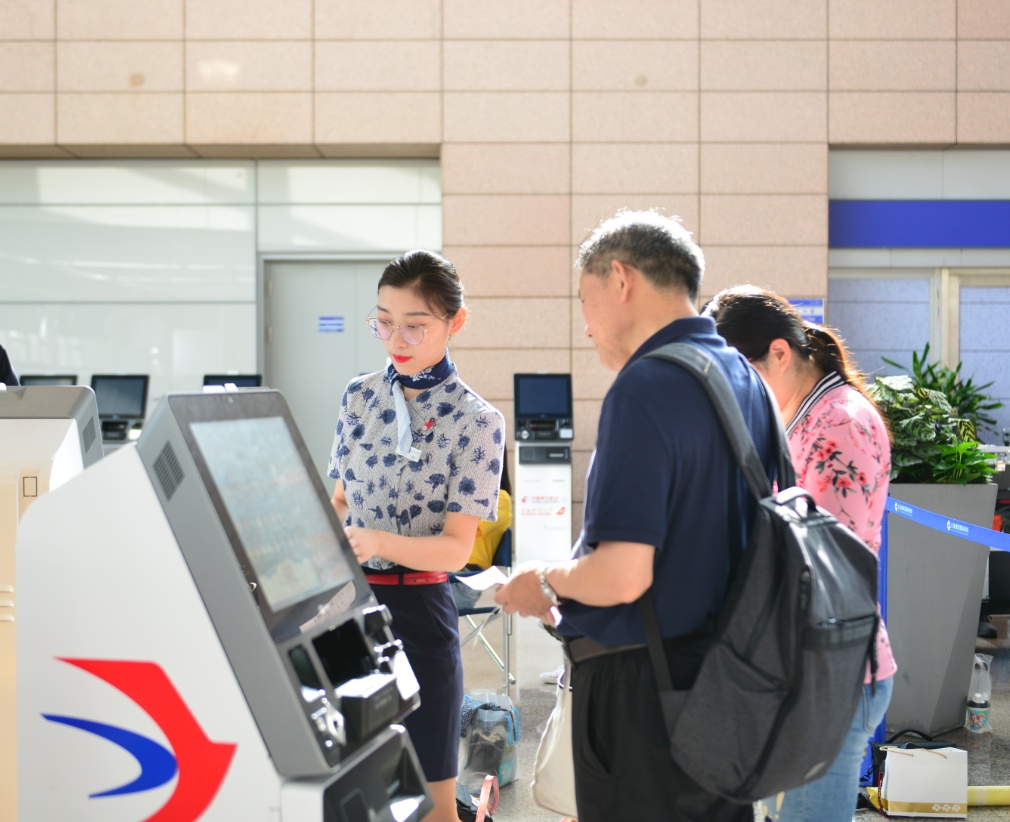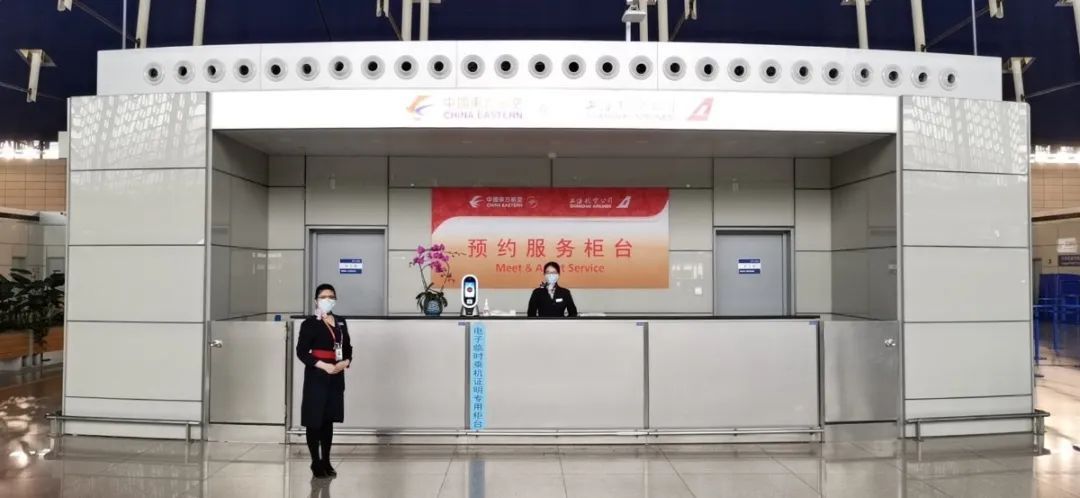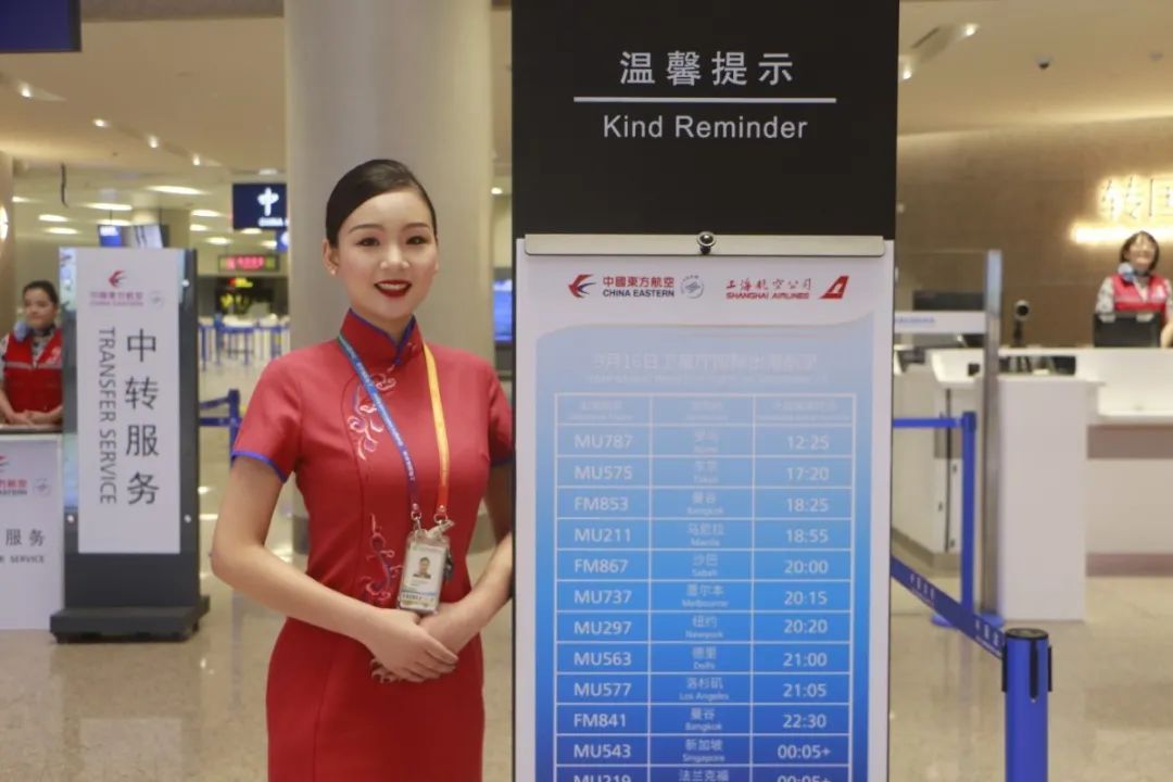 ▲浦东机场卫星厅提供中转指引的东航工作人员