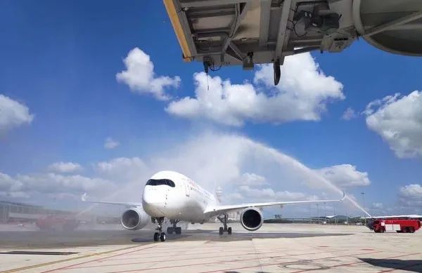 ▲从主基地上海浦东国际机场卫星厅首架起飞的东航A350-900客机