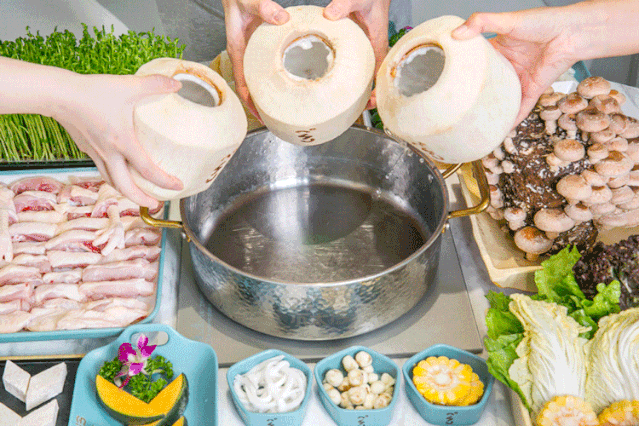 一年用掉1500000+颗椰子,一锅标配3个泰国香水椰做汤底,全程不加一滴水,搭配每日坐早班机过来的海南文昌鸡,养颜又滋补。