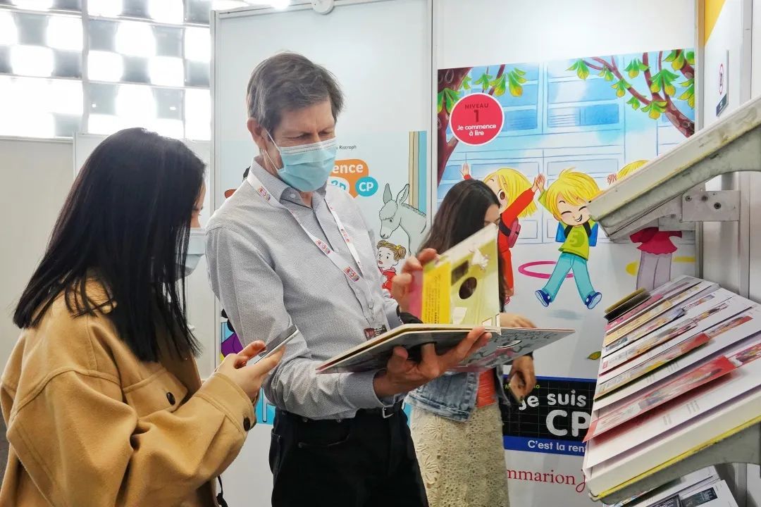 在版权区,展商和专业观众可在现场翻阅、触摸各国童书。对于童书而言,在屏幕上看书、选书有很大局限性,而手与书的触感常常是重要评判要素。接下来的洽谈则转到线上,本届童书展重磅推出升级版的“在线商务配对系统”。