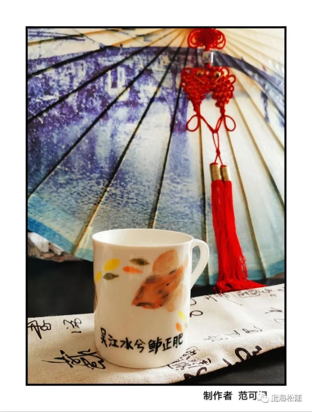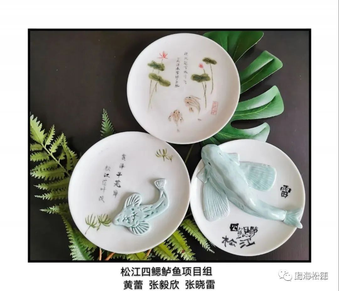 另一组学生陆闻语、唐琪佳和陈刚在参观了学校附近的张明艺术馆后受到启发,从美学空间中汲取了创作灵感。“在让人充满惊喜的艺术美学生活空间,四处陈列着艺术品。其中,有一套画着四鳃鲈鱼的杯具令我们驻足,杯壁上的鲈鱼鲜活精致,笔触韵律无穷。”