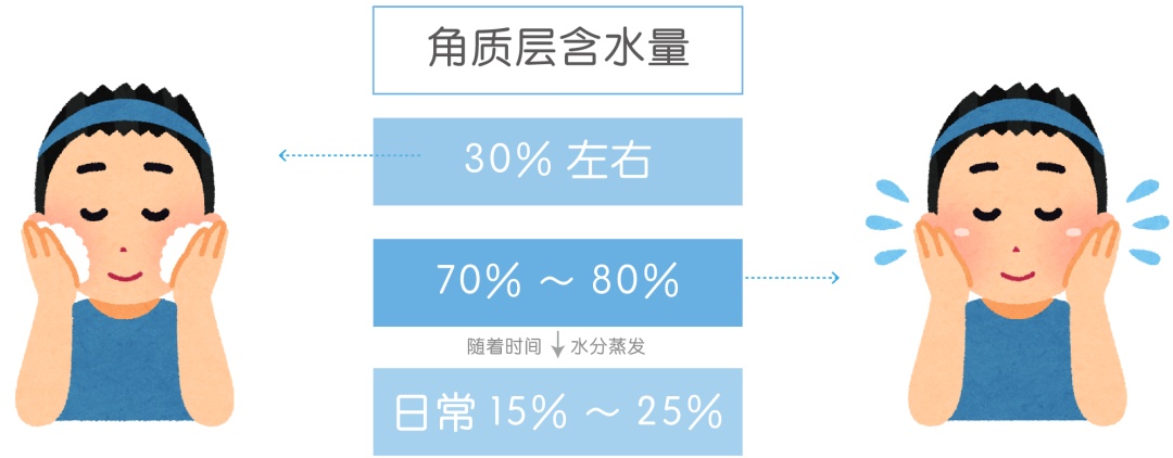 清洁皮肤后,角质层含水量在30%左右,涂完化妆水或乳液后,短期内角质层含水量能达到70%~80%,不过约40%的水会在两分钟内蒸发掉。所以保湿护肤品要做的不仅是帮助补充水分,还需要在皮肤表面形成一层油膜,减少水分蒸发。