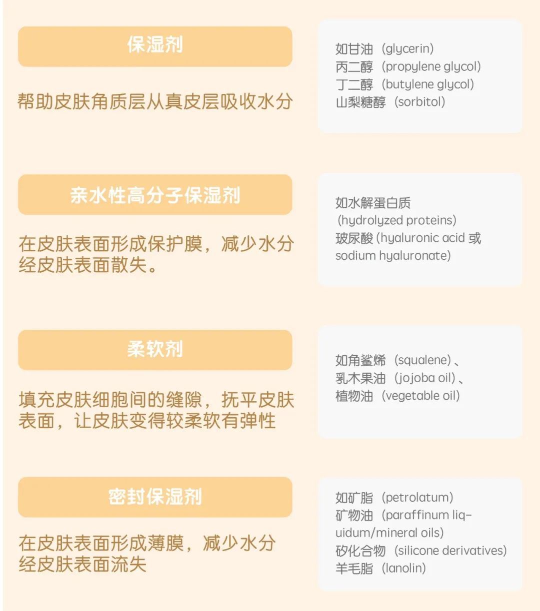 和古人什么都拿来用一用不同,现代科学对有效的保湿成分有了清晰的了解,对抗干燥不用在天马行空。想购买较佳保湿效果的护肤品,你可以留意产品是否包含以下保湿成分: