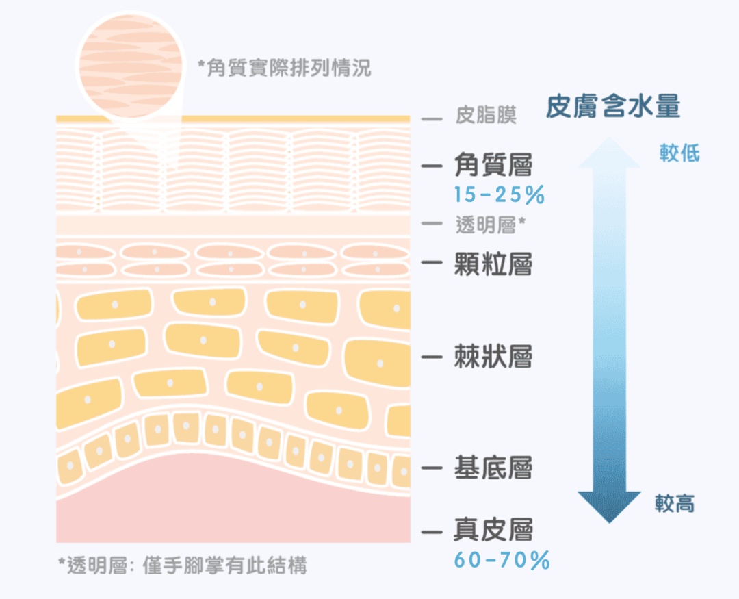 皮肤表皮分为角质层、透明层、颗粒层,是肌肤保持水分的关键。