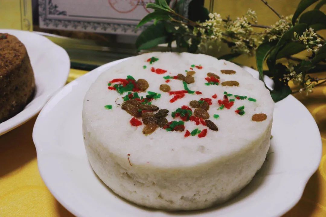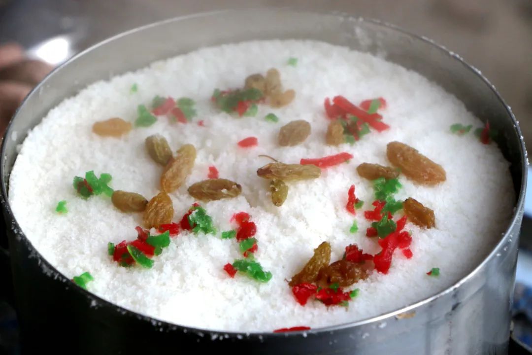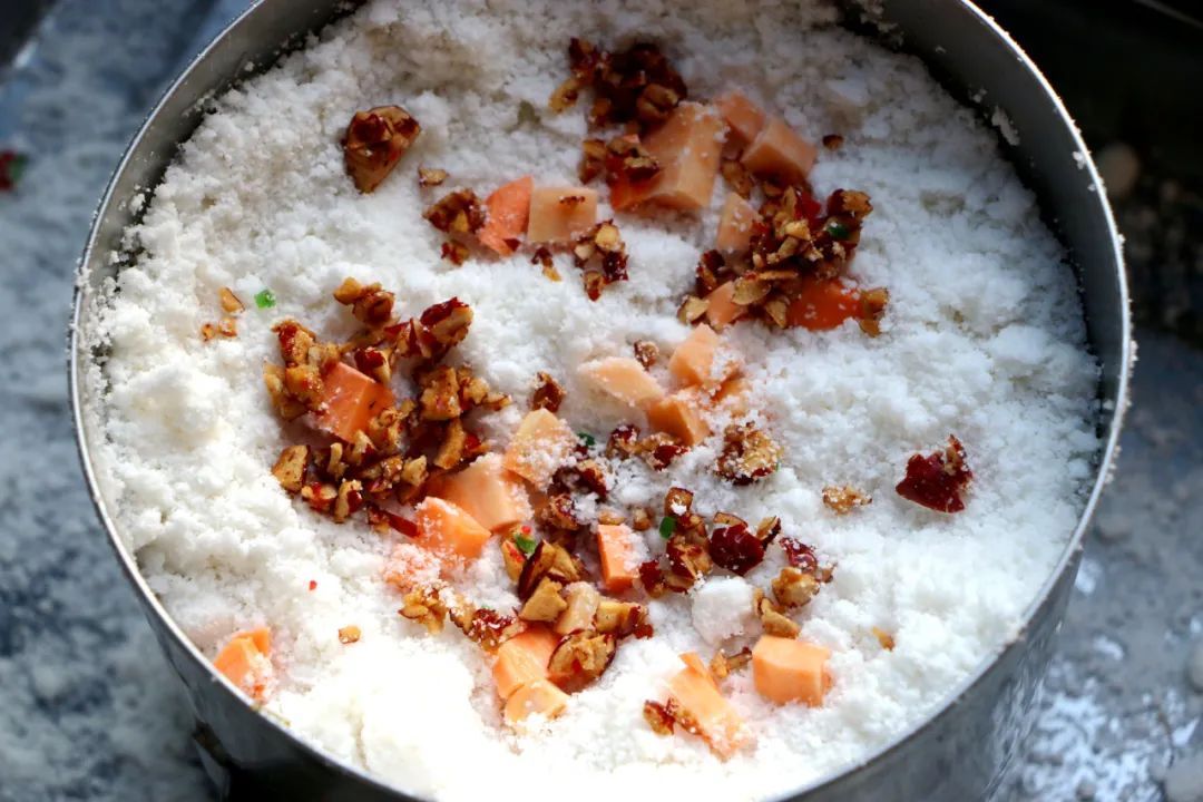 然后预热蒸笼,在底层铺上米料,中间放上糖桂花和红薯,最后再铺一层米料,撒上糖冬瓜、葡萄干等佐料即可。