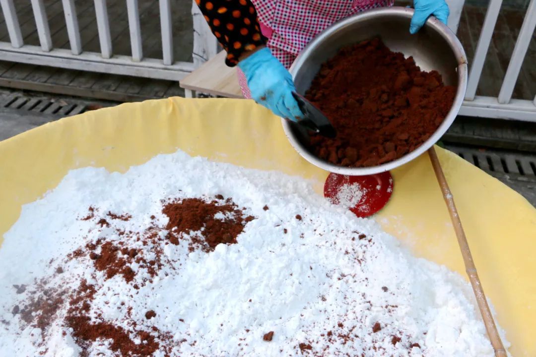制作流程上,首先把粳米、糯米和白糖放入竹筛内混合,再用筛子将结块的面粉揉散,保证口感的细腻。