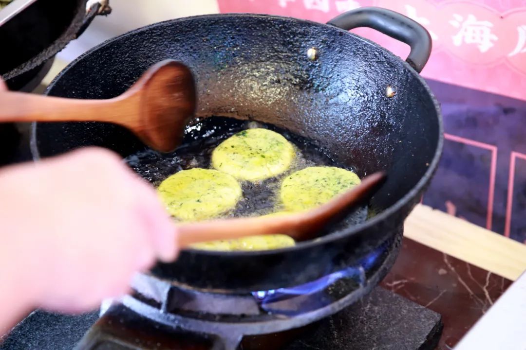 为了最大程度保留原汁原味的口感,制作时需先将草头饼放入菜籽油中炸至半熟,然后再放入平底锅中翻转,烘至完全熟透。