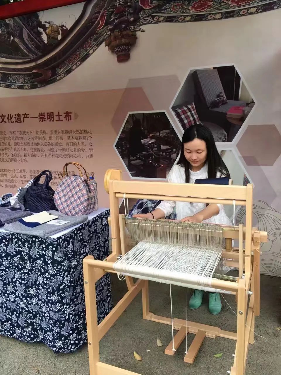 崇明区布布瀛创新工作室,结合世界流行时尚和崇明传统技艺,创新开发设计土布文创产品,制作出既时尚又传统的极具崇明特色的文创产品。在观看崇明土布文创产品的同时,还可以亲自体验织布的乐趣。