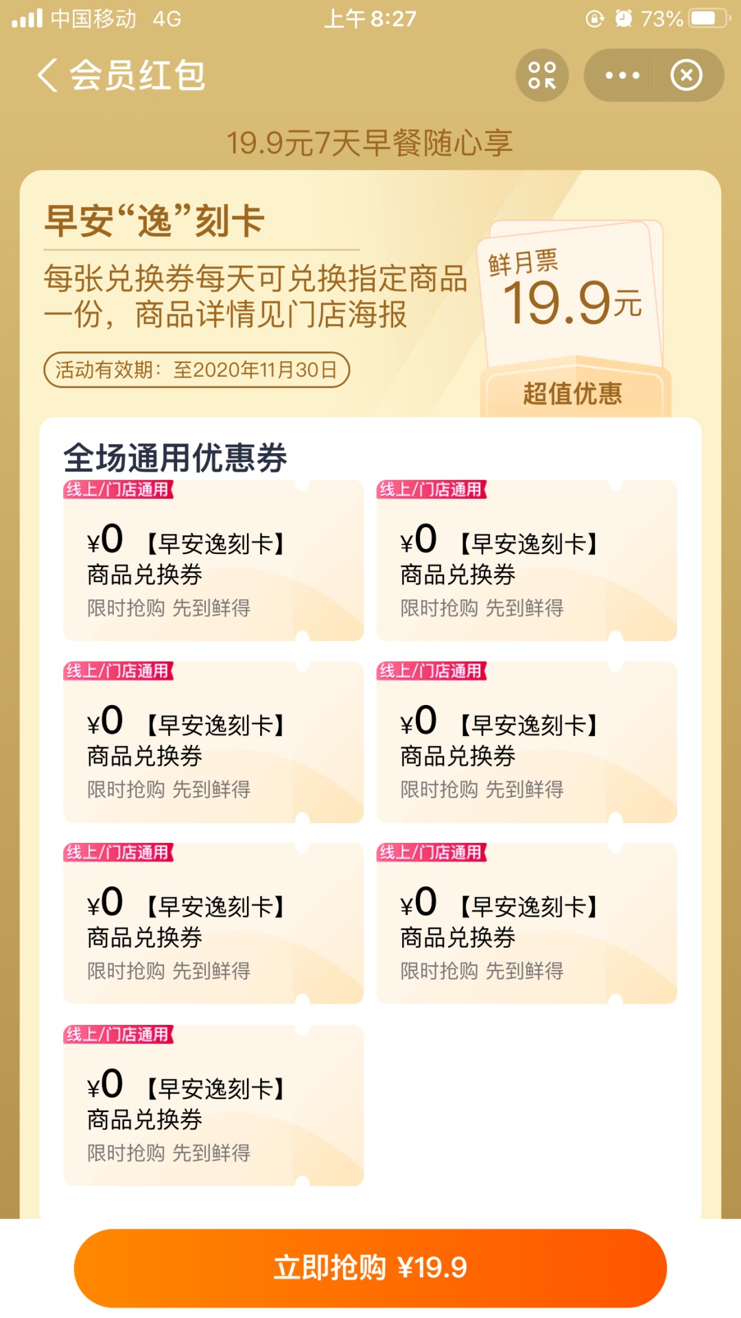 记者注意到,市民只需花费19.9元购买早餐卡,即可获得7张商品兑换券,平均一张商品兑换券只需2.9元。在一周内,每天上午7点至10点半,都可以到店出示一张电子的商品兑换券,即可获得早餐商品。