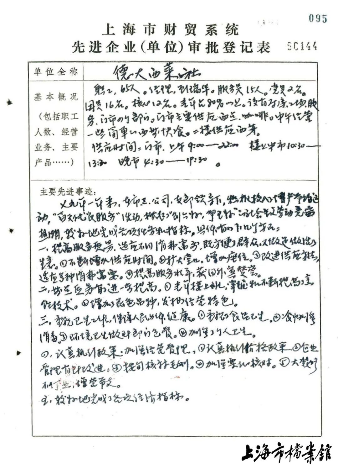 1980年,上海市财贸系统先进企业(单位)审批登记表-德大西菜社(上海市档案馆藏)